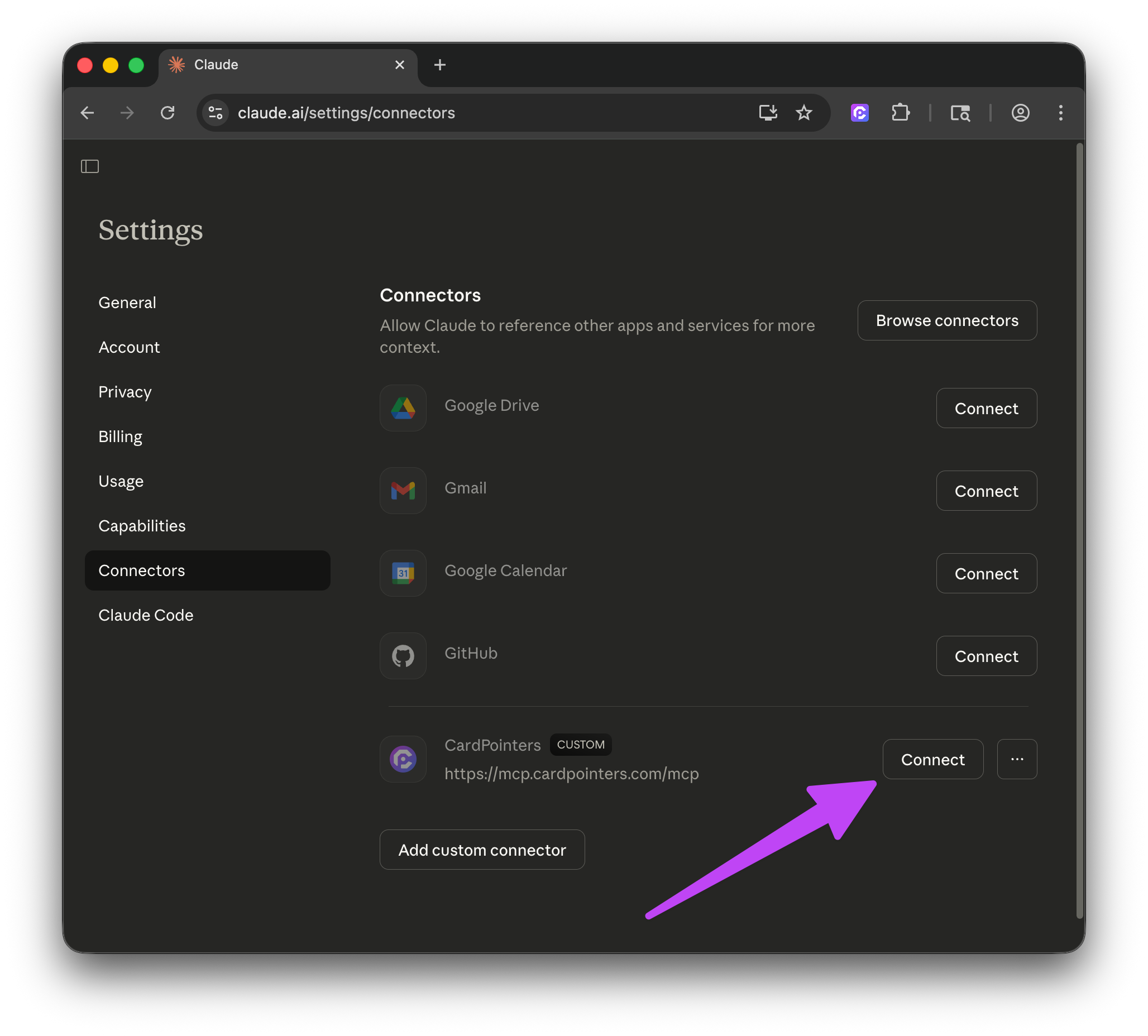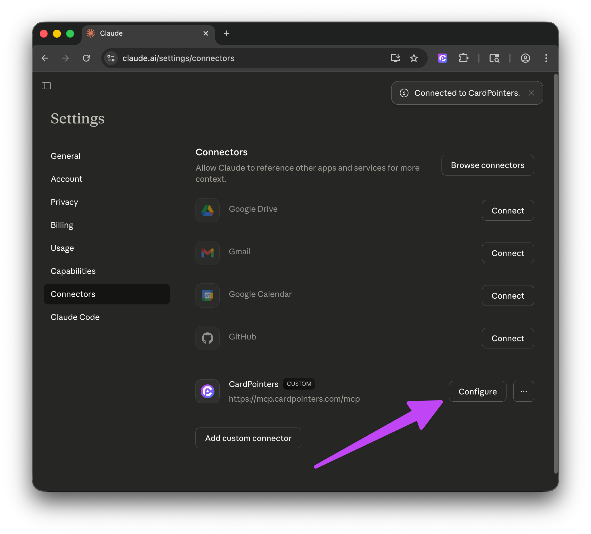 Configureonce you're back on Claude's site and seeConnect to CardPointers