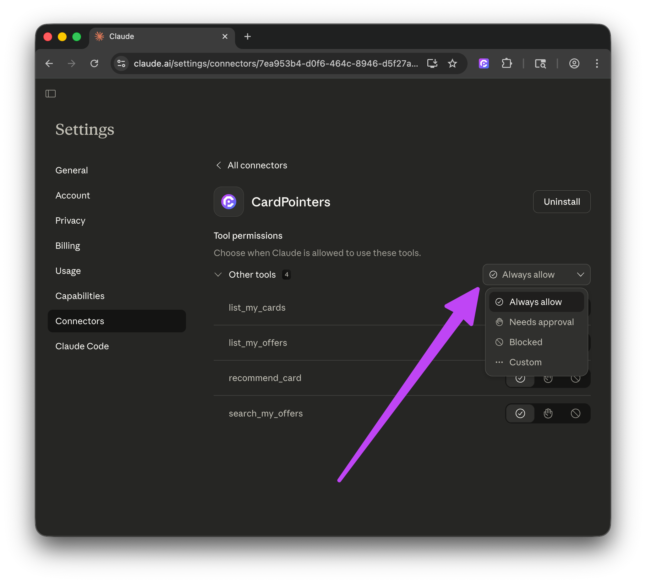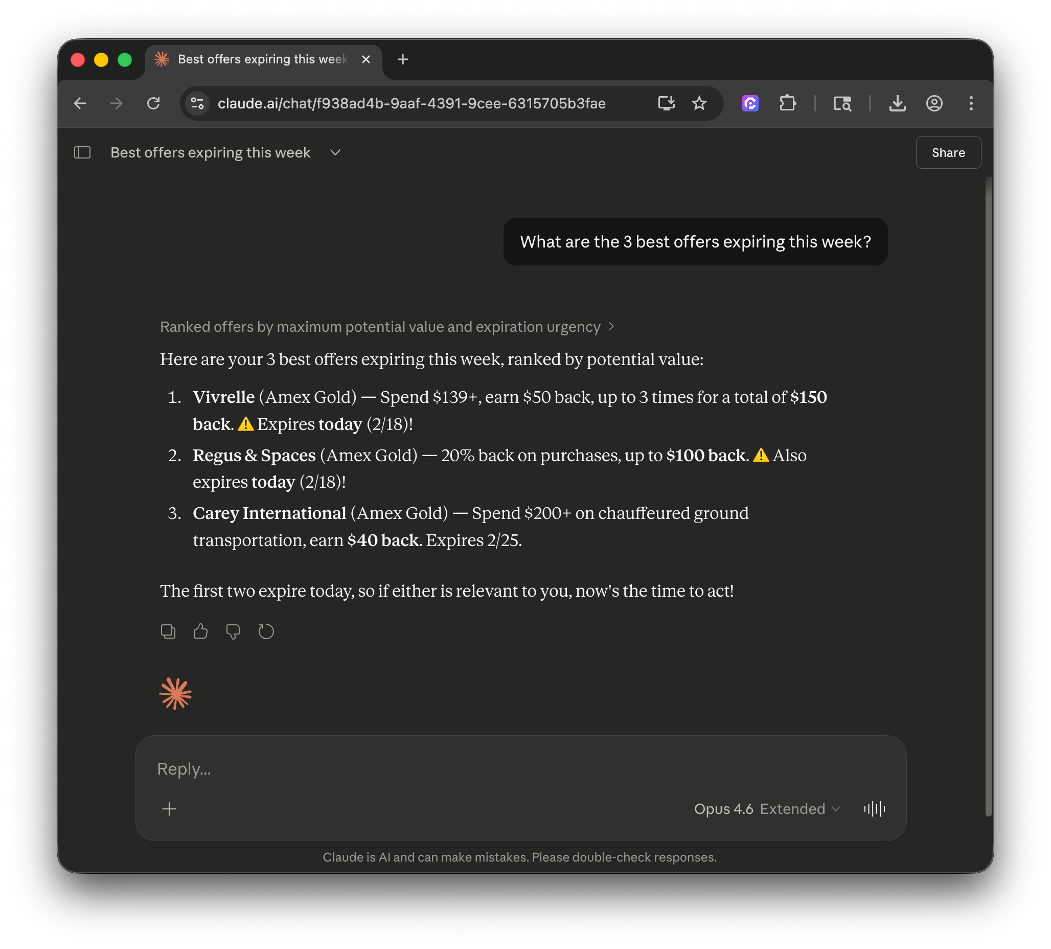 You're all set! X out of settings, and you can then ask Claude anything about your cards or offers, or recommendations for which card to use for a specific category or store. It's automatically updated and sync'd in real-time, and it works on the web and in the Claude app, too.